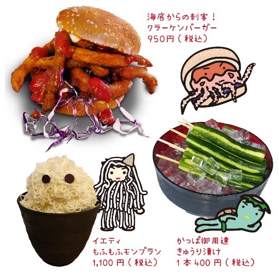 ドムドムバーガーによる「クラーケンバーガー」、茶々工房の「イエティもふもふモンブラン」、そして「かっぱ御用達きゅうり漬け」というコラボフードも登場。不思議体験は味覚にも及びます。