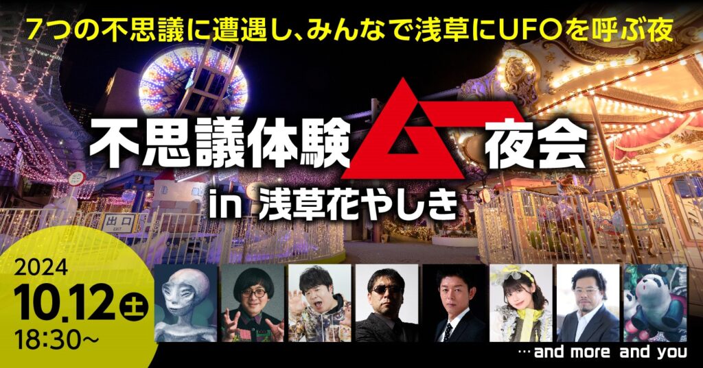 「ムー」関係者や豪華ゲストが園内に隠された7つの不思議を体験し、来場者と一体となって、UFOを呼ぶ……。創刊45周年がお送りする、奇跡の一夜となる。