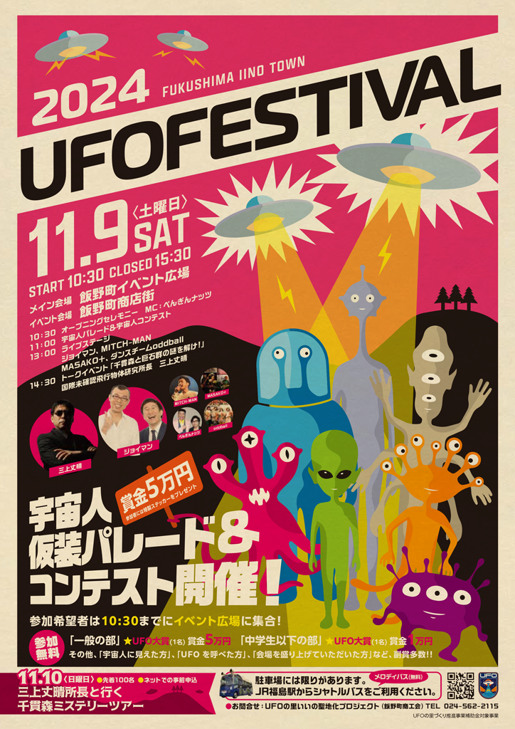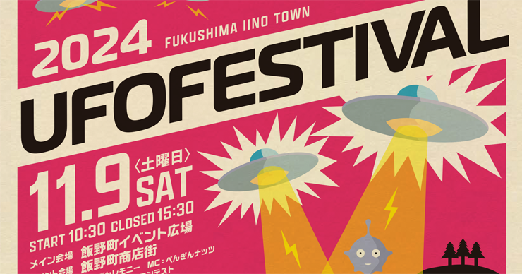 UFOの里いいの聖地化プロジェクト(福島県福島市飯野町)は、第3回目となる「UFOフェスティバル2024」を今年も開催。日程は11月9日(土)となる。昨年も町中が宇宙人らしき集団であふれたイベントだが、今年はさらに多くのエイリアンが侵略してくるのではないだろうか?
