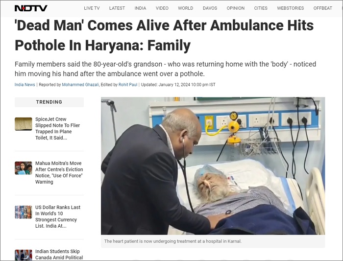 'Dead Man' Comes Alive After Ambulance Hits Pothole In Haryana: Family https://t.co/cGIIFM8ijV pic.twitter.com/r38XST9Zno
