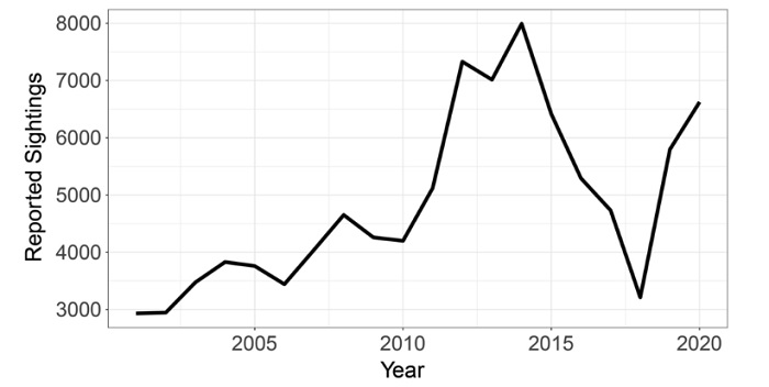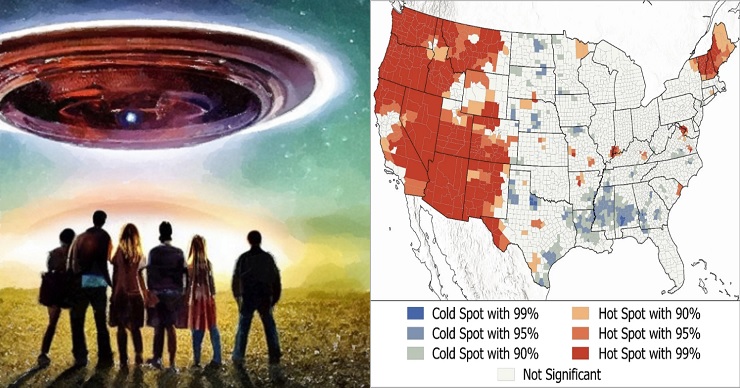 今回、ユタ大学の研究チームは2000~2020年の間に「全米UFO報告センター」(National UFO Reporting Center、NUFORC)に届けられた約10万件のUFO目撃報告を徹底調査。それぞれの発生地をマッピングしたところ、なんと21世紀に突入してから米国におけるUFO目撃事件は、ほとんどが西部で起きているという事実が浮かび上がってきたのだ。中央部や東部でも一部の都市周辺や、北東部3州(バーモント州・ニューハンプシャー州・メーン州)に限って報告件数は多いが、それにしてもロッキー山脈を境にこれほど明確にUFO目撃事件の発生数に違いがあったのだ。