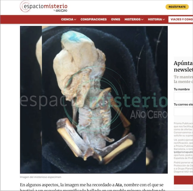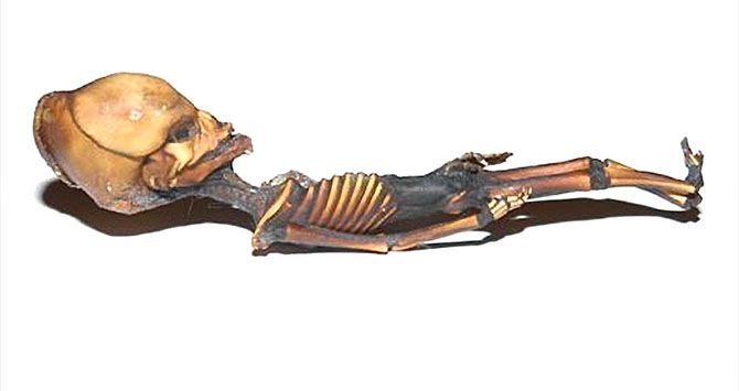 しかしギハーロ氏も指摘しているように、この遺体の最も特筆すべき点は、2003年にチリの砂漠にある教会跡地で発見されて世界を驚かせた正体不明の小型ミイラ「アタカマ・ヒューマノイド」(通称:アタ)によく似ていることだ。身体のサイズはもとより、尖った頭蓋骨、そして何よりも10対という肋骨の数まで共通しているのだ。