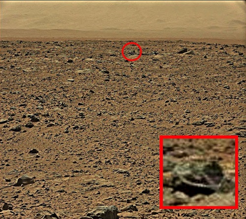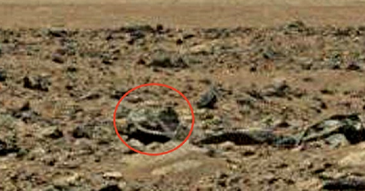興味深い発見を公開したのは、台湾在住のUFO研究家スコット・ワリング氏。NASAが提供する火星探査機からの写真を確認していたところ、「ちょっと奇妙なもの」を発見したという。ワリング氏が提示した写真は、一見したところ岩と砂だらけの荒涼とした火星の地表にすぎない。しかし、その地平線近く、赤い丸印で囲われた部分に何かがボコっと転がっている。