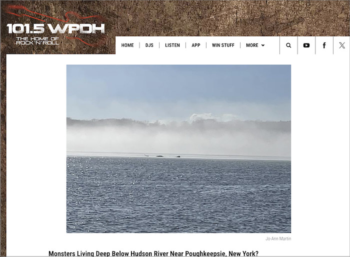 今回の騒動の発端は、ハドソン渓谷に住むジョー・アン・マーティン氏がソーシャルメディアに投稿した写真だ。3月のある日、早朝に撮影したという写真には、ハドソン川の水面と対岸の木立が写っている。異様なのは、その中央付近に見える黒いシルエットだ。水面から体の一部分を見せた“それ”は左端が尻尾のように細く、背中は弧を描き、右端に丸い頭部のような形状が確認できる。