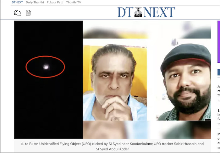 クーダンクラム原子力発電所でUFOを目撃したのは、サイード・アブドゥル・ケイダー巡査。警察官という職業から考えても、虚偽の報告をおこなうとは考えにくい。すでに巡査はUFOを10回以上目撃し、撮影にも2回成功したという。唯一公開された画像には、闇夜にぼーっと光る物体が浮かんでいるが、残念ながら輪郭がぼやけているためはっきりした形状は確認できなかった。