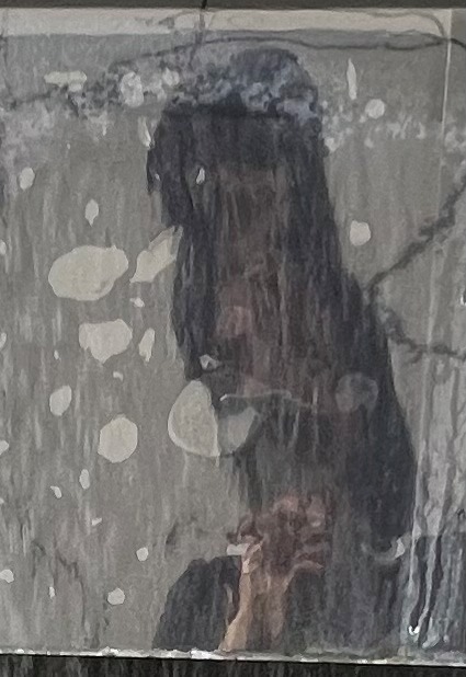 多くの写真のなかでも特に無気味なのがこの写真。ある店舗用物件の内見時に撮った一枚で、不動産業者から「事故物件ではない」と念を押されるなか何気なく鏡を写したところ撮れていたのだそうだ。つまりこの黒いものは鏡に映った中野さんなのだが、その頭部が異常に伸びている。鏡はシートで保護されていたが歪んではおらず、内見時には普通に見えていたため、あとで写真を確認して驚いたという。