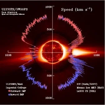 星間物質は、1立方センチあたり数個の陽子と電子で、希薄だが、エネルギーは数テラ電子ボルト=TeVもある。太陽は数テラ電子ボルト=TeVの星間物質を両極から取り入れて、赤道部から数メガ電子ボルト=MeVの太陽風として放出する。星間物質と太陽風のエネルギーは1000倍も電位差がある。