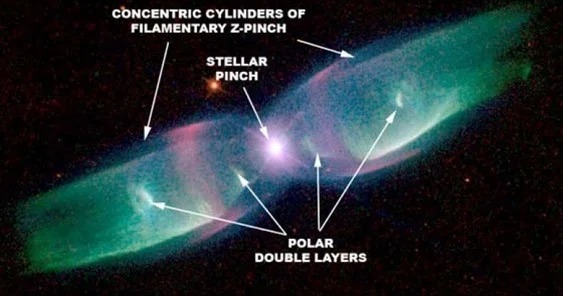電気的宇宙論では、星間物質のビルケランド電流が恒星を作ると主張している。2本のビルケランド電流が近づくと互いの磁場でねじれていく。ねじれの結び目に磁場による圧縮が起きて、星間物質が集中する。結び目が恒星の発端になるのだ。