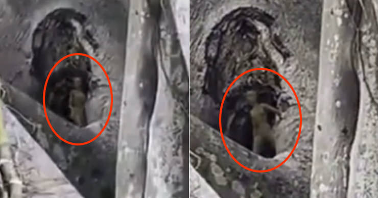 大きな木へと近づいていく撮影者。カメラが幹に開いた大きな穴にズームインすると、その中で何かが動いているようだ。映像をよく見ると、それはリスのような小動物とはまったく異なり、直立二足歩行の人間らしきシルエットだ。頭部や胴体、四肢まで明確に確認することができ、穴の縁に手をかけて身を乗り出し、カメラを見つめていた模様。しかも、カメラが寄り切ったところで自らが撮影されていることに気づいたのか、穴の奥へと隠れてしまうのだ。