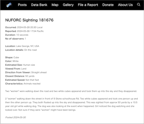 事件が発生したのは5月28日の夜。マンハッタンから車で3時間半の距離にあるレイク・ジョージ近郊、スクールハウス通りで、少女が犬の散歩をしていたところ、50フィート(約15メートル)先に女性2人の姿を目にした。すると、「2つの白い立方体」が頭上に現れ、続けざまに女性2人を連れ去っていったという。