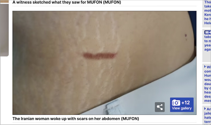 イラン人女性が接近遭遇した記録では、イカ型UFOについて「たくさんの短い足を持ち、お腹の半分が青く半分が赤い、箱に入ったクラゲのようでもあった」らしい。しかも、(UFOと接触した)女性の腹部には赤いミミズ腫れのような傷跡が残され、全身の内側から外側まで焼けるような痛みがあったことが確認されている。
