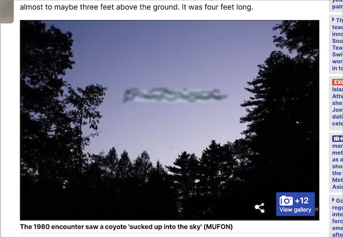 恐ろしいのはその直後に繰り広げられた光景だ。なんと、周囲のコヨーテがUFOに吸い上げられ、激しい振動が起こった約3分後、骨が砕けるような音が響き、UFOが飛び去る間際に“肉の塊”と化したコヨーテの死骸が落ちてきたというのだ。