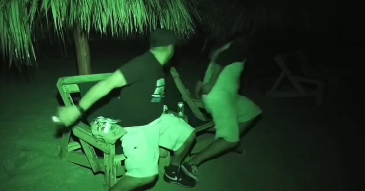 ビーチチェアに座って会話している2人の男性。一見するとありふれた光景だが、2人の背後に突如として正体不明の「何か」が現れる。異変を察知した2人が振り返ると、細長い手足の怪物が膝を「く」の字に折るようにして歩いているではないか。男性たちは慌ててイスから飛び上がり、悠然と歩く怪物から逃げるように画面外へと消えていく状況がなんともリアルだ。