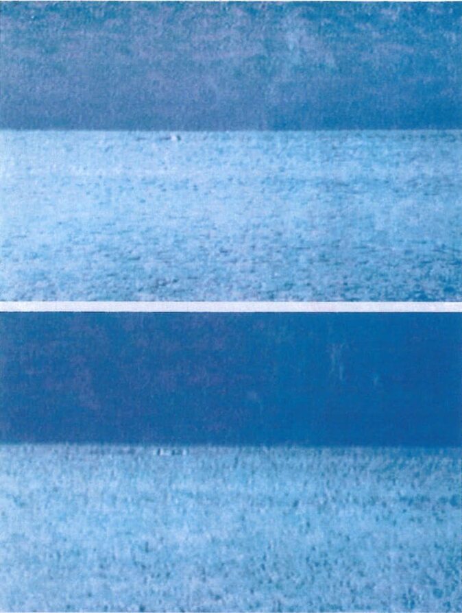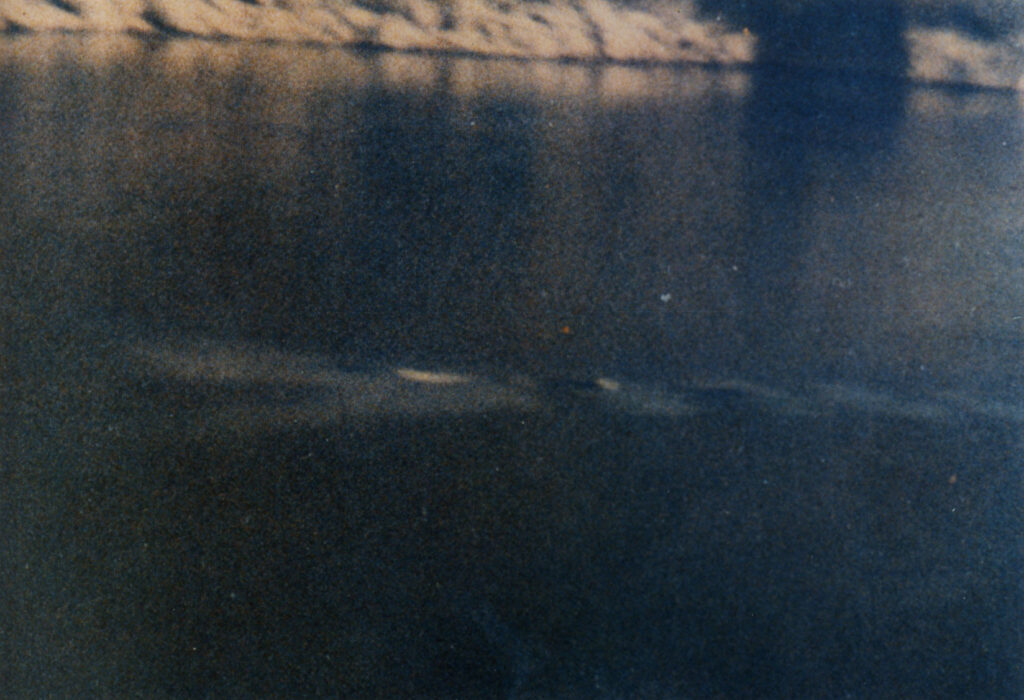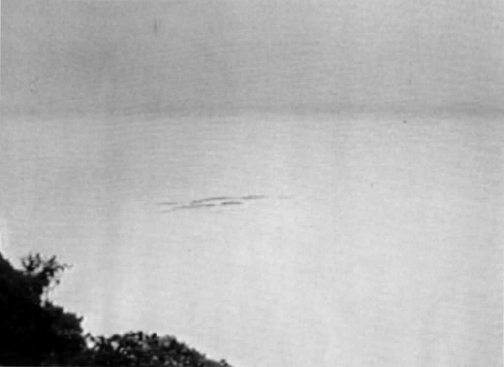 後日現像した写真には、得体の知れない物体が沈もうとする一瞬が捉えられていた。しかも物体の中央付近には、3つの黒い帯状のものも写っていた。