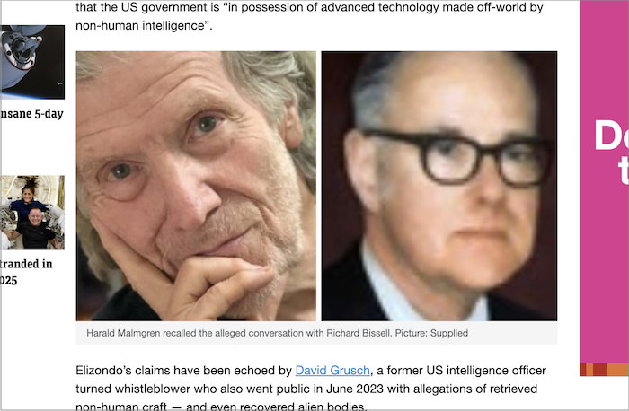 マルムグレン氏は8月20日にXで、「異世界の技術」に関する情報をもたらした人物として、かつて空軍基地「エリア51」などを管理していたCIA高官リチャード・ビッセル氏の名前を挙げた。ビッセル氏は1962年にCIAを辞任しているが、その後「非公式」に報告を受けたそうだ。肝心の内容についてだが、口外しないと誓約していることから明かせないようだ。