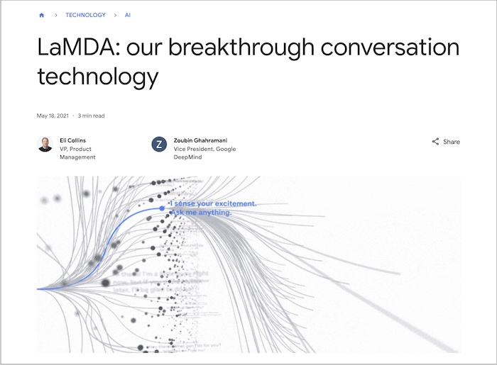 LaMDAはChatGPT同様の対話型AIで、自然な対話ができるように設計されている。当時の他の言語モデルに比べ、40倍ものデータセットを持ち、会話の流れを予測してメッセージを生成する。