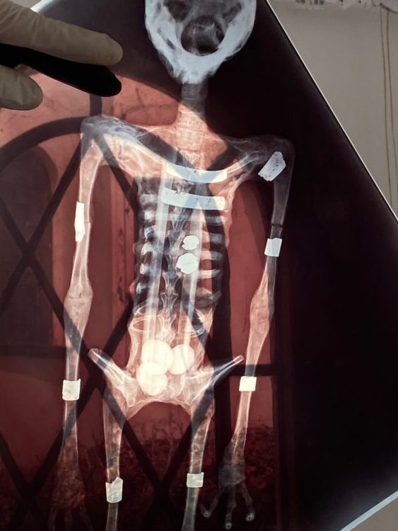 なぜ“メス”であることが判明したのかというと、「X」氏も所有する3体全てのミイラにX線分析やCTスキャン、DNA検査を行っており、その結果、ミイラの頭部には化石化した脳が残っていること、そしてうち1体には胸や腕、脚に謎の金属製プレートが埋め込まれており、下腹部に3つの卵形の物体が存在する“メス”であったことを確認しているのだ。