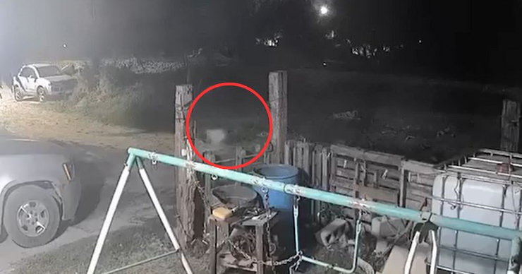 問題の映像を見てみると、夜間とはいえ近くに光源があるため、駐車中の車やブランコなどがはっきりと確認できる。木柵も設置されており、状況から判断すると防犯カメラは民家の軒先に据えられていたようだ。周辺には未舗装路が伸び、木柵越の向こう、画面右手から唸り声とともに白い小さな犬が駆けてくる。