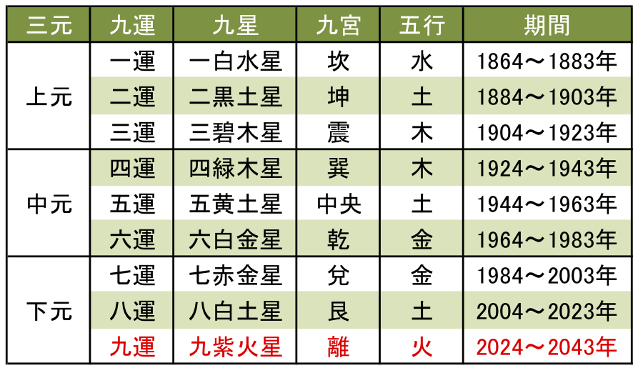 下の表を見ていただくとわかるとおり、2004〜2023年は八運でしたが、2024年の立春からは九運に入ります。ここで運が大きく変わっていくことになります。旧暦で見ますので、2024年の元日からでなく、節分から『九運に入る』というわけです」