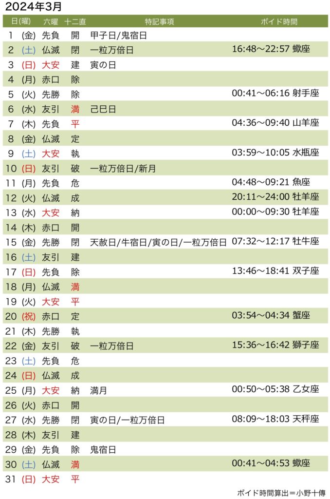 2024年3月のラッキーデーがわかる! 大安などの吉日のほか、宝くじ購入によいとされる一粒万倍日や、金運にツキのある寅の日などをご案内。