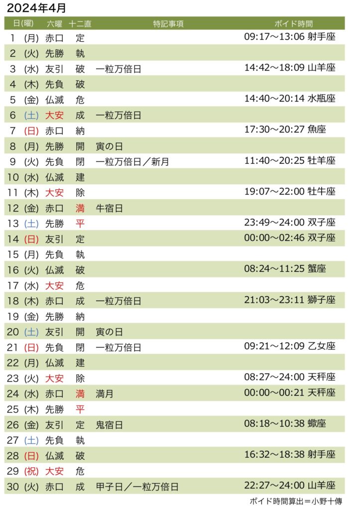 2024年4月のラッキーデーがわかる! 大安などの吉日のほか、宝くじ購入によいとされる一粒万倍日や、金運にツキのある寅の日などをご案内。