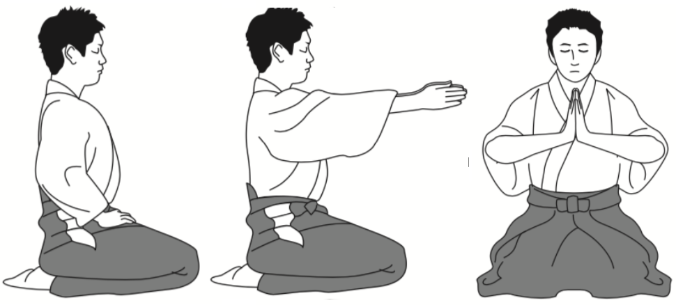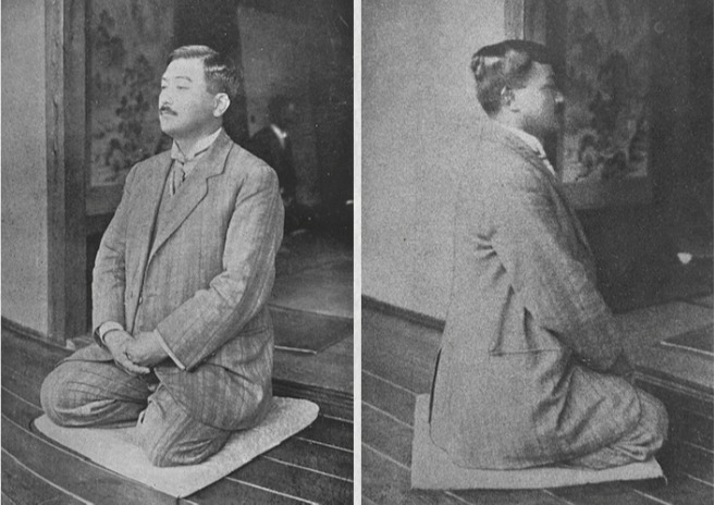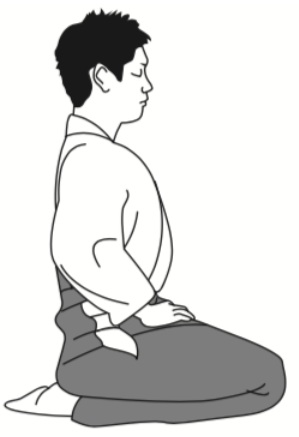 正座の仕方を知らない人はいないだろうと思うが、簡単に記せば、両足を折り畳み、かかとの上に腰を落とすのである。男性は右膝と左膝の間を握り拳ひとつくらい空け、女性は両膝を合わせる。畳や床が固い場合は座布団を使用してもよい。