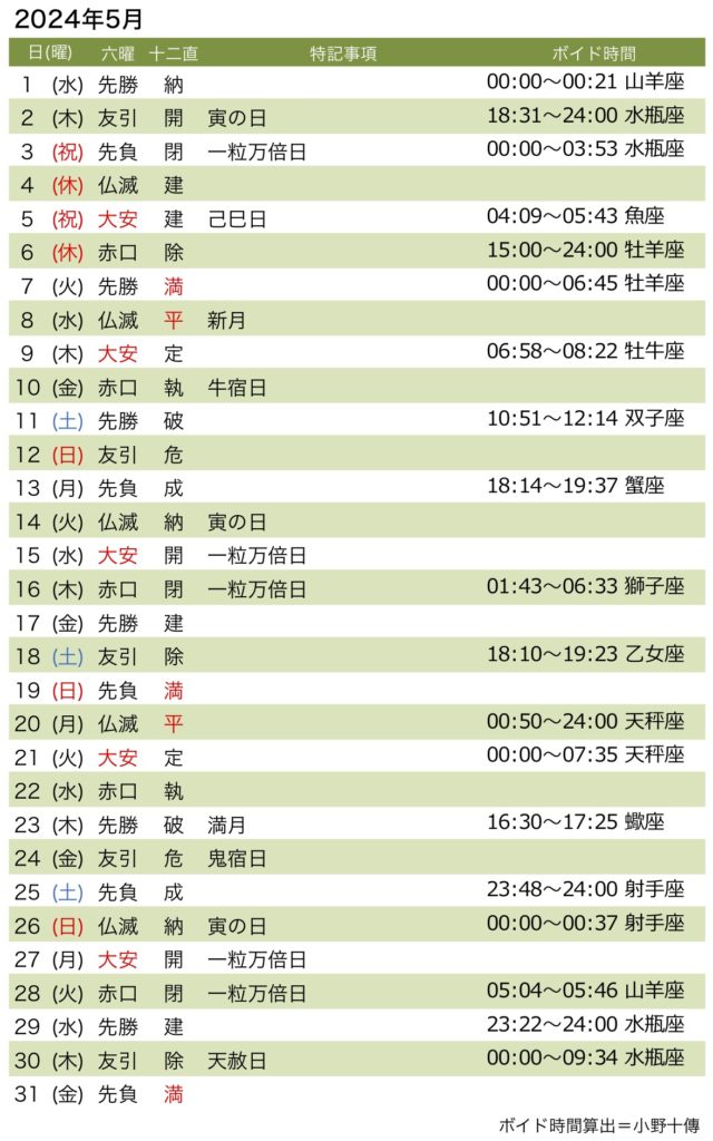 以下は、カレンダーで使用されている用語の説明です。 ◆特記事項 古来、民間で活用されてきた吉日を示しました。十干十二支や二十八宿などに由来します。 ▼天赦日(てんしゃにち) 天がさまざまな罪を赦(ゆる)すとされる日。 ▼甲子日(きのえねのひ) 日の干支が甲子の日。六十干支の最初であるため、物事を始めるのによいとされます。 ▼己巳日(つちのとみのひ) 日の干支が己巳の日。金運・財運に縁起のよい日とされます。宝くじの購入なども吉。 ▼鬼宿日(きしゅくにち) 宿曜占星術でいう鬼宿の日。二十八宿のうち最大吉日とされます。婚礼以外は万事に大吉。 ▼牛宿日(ぎゅうしゅくにち) 宿曜占星術でいう牛宿の日。鬼宿に次ぐ吉日で、正午とその前後を除けば万事に大吉。 ▼寅の日 日の干支に寅がつく日。旅行や金銭の出入りに大吉。財布の新調にも吉とされます。 ▼一粒万倍日(いちりゅうまんばいにち) ひと粒の籾(もみ)が万倍に実るという意味の吉日。しかし、この日に借金をすると、それが万倍になるので避けたほうがよいでしょう。ほかの吉日と重なれば一粒万倍の効果が増すとされます。 ◆ボイド時間 西洋占星術の技法で、月が太陽系のどの惑星ともアスペクト(意味のある角度)をとらない時間帯のこと。この時間帯には、以下に挙げる8つの注意点を守り、穏やかに過ごすことが難を避けるポイントとなります。 ①計画を立てない、②方針を変更しない、③結論を出さない、④重要な打ち合わせをしない、⑤情報を信用しない、⑥大きな契約をしない、⑦創造的なことをしない、⑧日常的なことは普段どおり行う。 なお、ボイド時間が自分の誕生星座と同じ場合は、いっそうの注意が必要です。 ◆六曜(ろくよう) 日本で最もよく知られている暦注のひとつで、幕末以降、広く普及しました。旧暦の朔日(1日)を基準に、先勝、友引、先負、仏滅、大安、赤口の6つが順に配当されます。 ▼先勝(せんがち/せんしょう) 「先んずれば勝つ」を意味し、急ぐことには吉。午前は吉、午後は凶。 ▼友引(ともびき) 何事も引き分けで、勝負のつかない日。友を引くという意味があるので、婚礼などの慶事には吉ですが、葬儀などの凶事には望ましくないとされます。朝夕は吉、正午は凶。 ▼先負(せんがち/せんぶ) 「先んずれば負ける」を意味し、何事も控え目にするほうが無難な日。勝負事も慎むほうがよさそう。午前は凶、午後は吉。 ▼仏滅(ぶつめつ) すべてに凶といわれる日。とくに婚礼などの祝い事にはよくないとされます。 ▼大安(たいあん) 「大いに安し」を意味し、万事に吉。婚礼などの祝い事には、とくによいとされます。 ▼赤口(しゃっく/しゃっこう) 正午のみ吉で、ほかの時間帯は凶。とくに祝い事には大凶とされます。火の元や刃物によるケガなどに要注意の日ともいわれます。 ◆十二直(じゅうにちょく) 飛鳥時代から昭和初期まで用いられた暦注のひとつ。六曜が広まる以前は、十二直によって吉凶を判断するのが一般的で、最もよく当たる暦注とされていました。 ▼建(たつ) 万物を建て、生じる日。物事を始めるのは大吉、土を動かすことは凶。 ▼除(のぞく) 妨げとなるものを除く日。掃除、治療、祭祀、種まきは吉。婚礼や旅行は凶。 ▼満(みつ) すべてが満たされる日。新規事業、移転、旅行、婚礼は吉。土を動かすことは凶。 ▼平(たいら) 物事が平らかになる日。旅行、祝い事、道路の修理は吉。婚礼は大吉。掘削は凶。 ▼定(さだむ/さだん) 物事の善悪が定まる日。開店、婚礼、売買は吉。旅行や訴訟は凶。 ▼執(とる) 物事を執り行う日。祝い事、祭祀、種まきは吉。旅行や金銭の出入りは凶。 ▼破(やぶる) 物事を突破する日。交渉事は吉。祭祀、普請、移転、祝い事は凶。婚礼は大凶。 ▼危(あやぶ/あやう) 物事が危ぶまれる日。何事も控え目に。 ▼成(なる) 物事が成就する日。新規事業、開店、移転、見合い、普請などは吉。交渉事は凶。 ▼納(おさむ/おさん) 「収」とも。何かを納め入れる日。収穫、買い入れ、新築は吉。見合いと婚礼は凶。 ▼開(ひらく) 物事が開き、通じる日。新築、移転、開店、婚礼は吉。葬儀は凶。 ▼閉(とづ/とず) 物事が閉じる日。帳簿締め、墓やトイレの築造は吉。開店、婚礼、新規事業、旅行は凶。