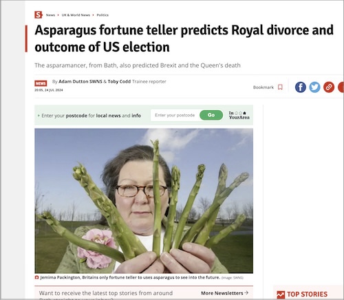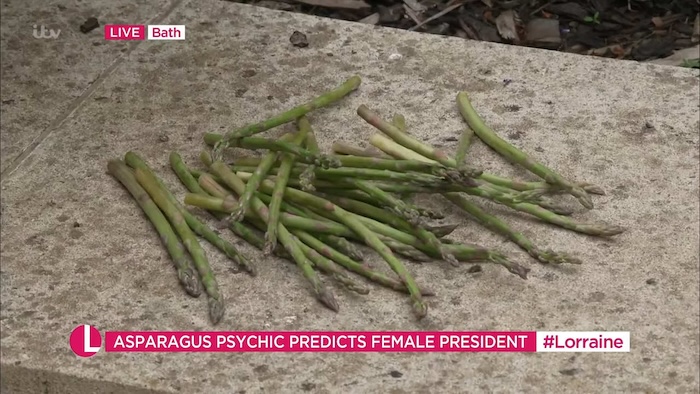 過去にもお伝えした通り、パッキントン氏は地元で「アスパラマンサー(アスパラ占い師)」の愛称で親しまれている。彼女の占いの最大の特徴は、易占の筮竹(ぜいちく)のようにアスパラガスを投げ、地面に落下した茎の向きで予言するというもの。パッキントン氏は以前、ソーシャルメディア上でインタビューを受けた際、次期米大統領は“女性になる”と占っていた。