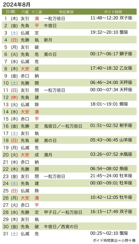 2024年8月のラッキーデーがわかる! 大安などの吉日のほか、宝くじ購入によいとされる一粒万倍日や天赦日、金運にツキのある寅の日などをご案内。