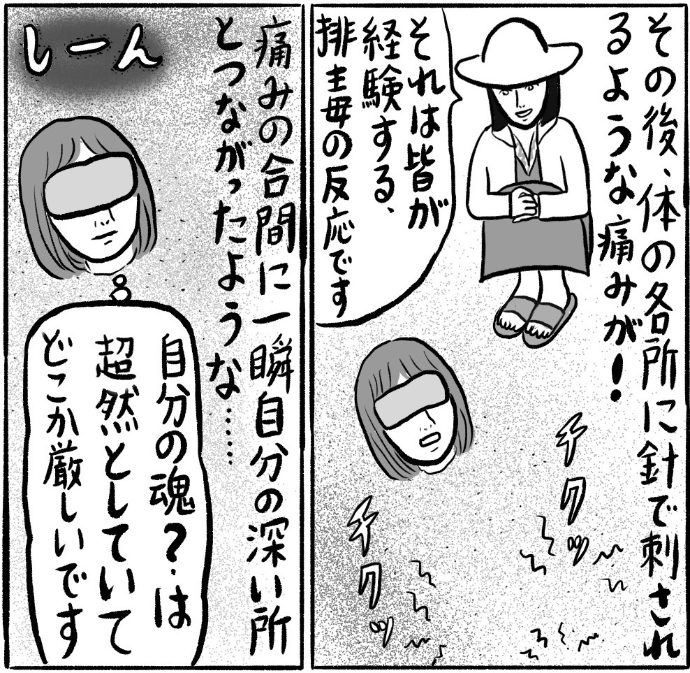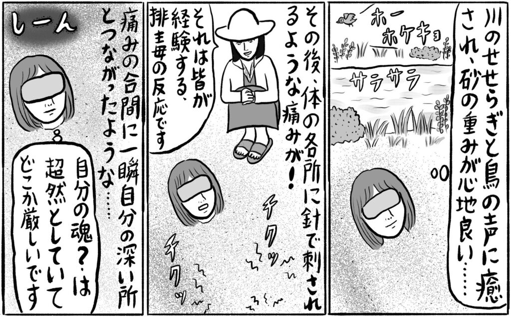 砂浴の前には大地に手をついて微生物や地球に挨拶。砂に埋まると適度な温度と重量感が心地よいです。体がドクドクと脈打つ感覚や、排毒のチクチクする痛みの合間に感じたのは「私たち人間は地球の子供」という思いでした。「地球なんていう波動の低い星に生まれなければよかった。シリウスがうらやましい」と、スターシード幻想に逃避していたのですが、人間に生まれた以上は地球が母親であり、その母親を悲しませるようなことをしてはいけないと、地球愛が湧きあがりました。