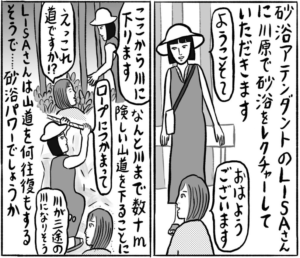 「砂浴」を世に広める活動をしているという、砂浴アテンダントのLISAさん。大江戸温泉物語の「砂風呂」に入ったことはありますが、不特定多数の人が入る狭い砂風呂と、大自然の砂に埋まる「砂浴」では浄化力のレベルが違います。