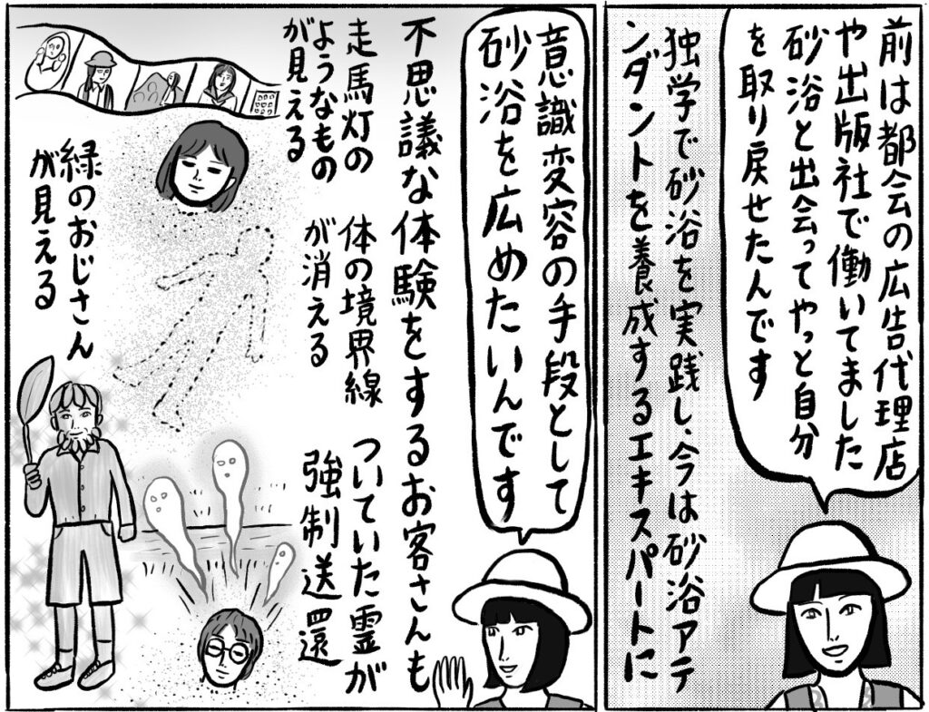 「砂浴の最中は、地球と自分がひっくり返るような感覚がありました。砂浴は昭和の時代から自然療法のひとつでしたが、風の時代ならではの切り口で広めたいです。今は地球の波動も上がっているので、変性意識状態に導かれてトラウマが癒されたり、左脳と右脳が共鳴したりと、目覚ましく変化しています」
