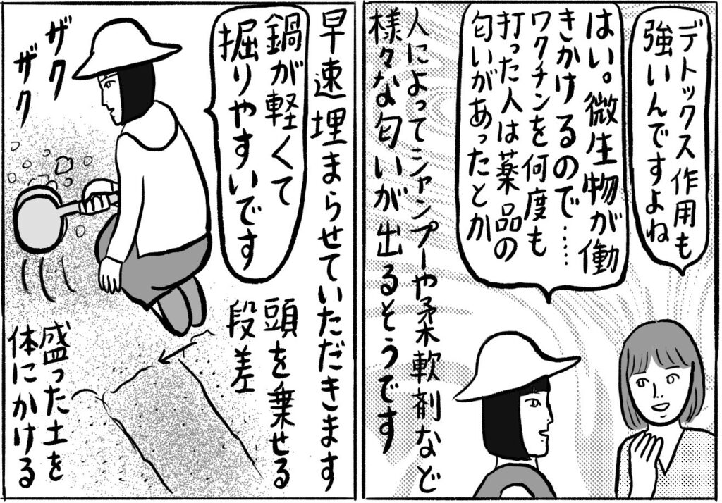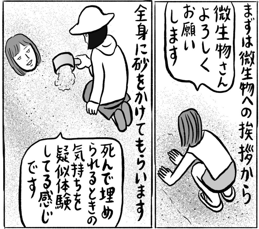 「今までいろいろなセラピーや健康法を試してきましたが、砂浴がいちばん効果がありました。アーシングできるだけでなく、砂の中の微生物たちがデトックスを促してくれるんです」