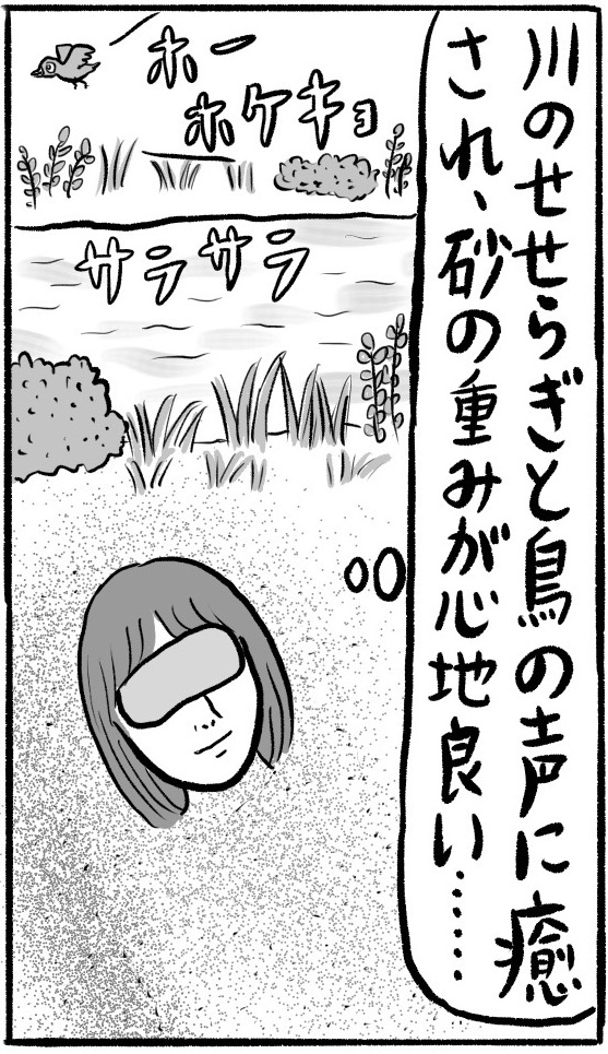 大自然の中で砂に埋もれることで、身も心もデトックスしてスッキリ! 体験中に走馬灯のようなものを見た、緑のおじさんを目撃した、といった不思議な事例もあるとのこと。都内某所で、川原の砂に首まで埋もれた辛酸氏は、どんな体験をしたのか!?