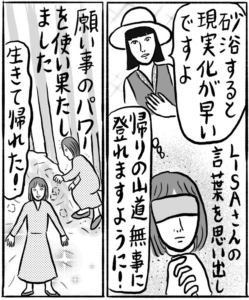 砂浴をつづければ、大荷物を持ってサンダルで険しい斜面を軽々と往復する、超人のようなLISAさんに近づけるかもしれません……。高齢化社会を生き抜くためにもおすすめの健康法です。