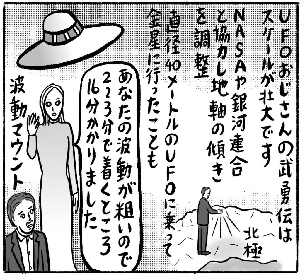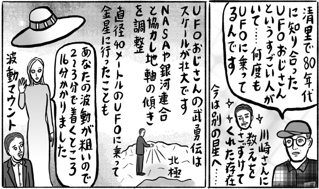 UFOおじさんは、宇宙存在から「アメリカに行きなさい」といわれ、見知らぬ人物に大金入りのスーツケースを渡されて単身渡米。マフィアの大ボスのガンを治したり、ペンタゴンの超能力テストにパスしたり、異星人と交流したりと、さまざまな伝説を残しました。月の内部には400人くらい住んでいたとか、金星の内部にも金星人が住んでいて自然が豊かだったとか、驚くべき体験談を川崎さんに語ったそうです。