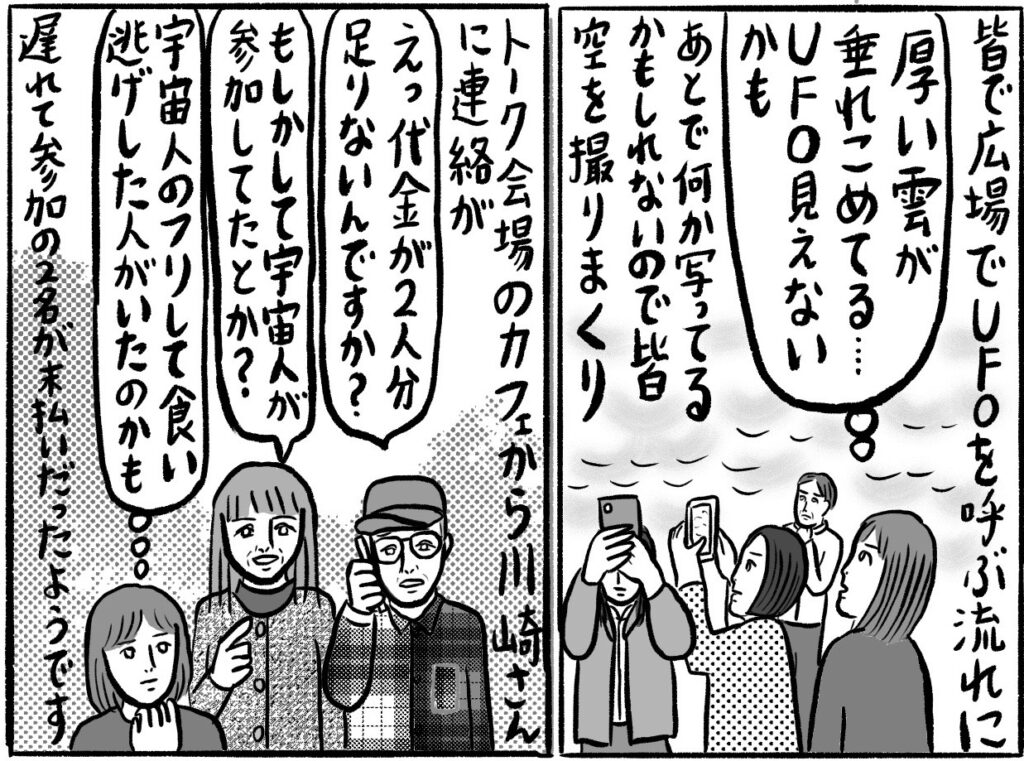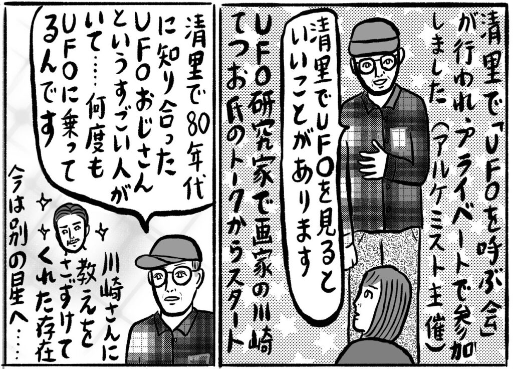 さらに強烈だったのは、清里のカリスマ的存在「UFOおじさん」との出会い。川崎さんが少年時代にUFOを呼んだときの「ベントラベントラ、こちらCBA。空飛ぶ円盤さん、飛んできてください」という文言は、じつはその昔、UFOおじさんが広めたものだったとか。