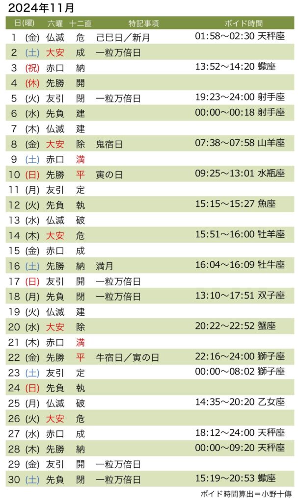 2024年11月のラッキーデーがわかる! 大安などの吉日のほか、宝くじ購入によいとされる一粒万倍日や天赦日、金運にツキのある寅の日などをご案内。