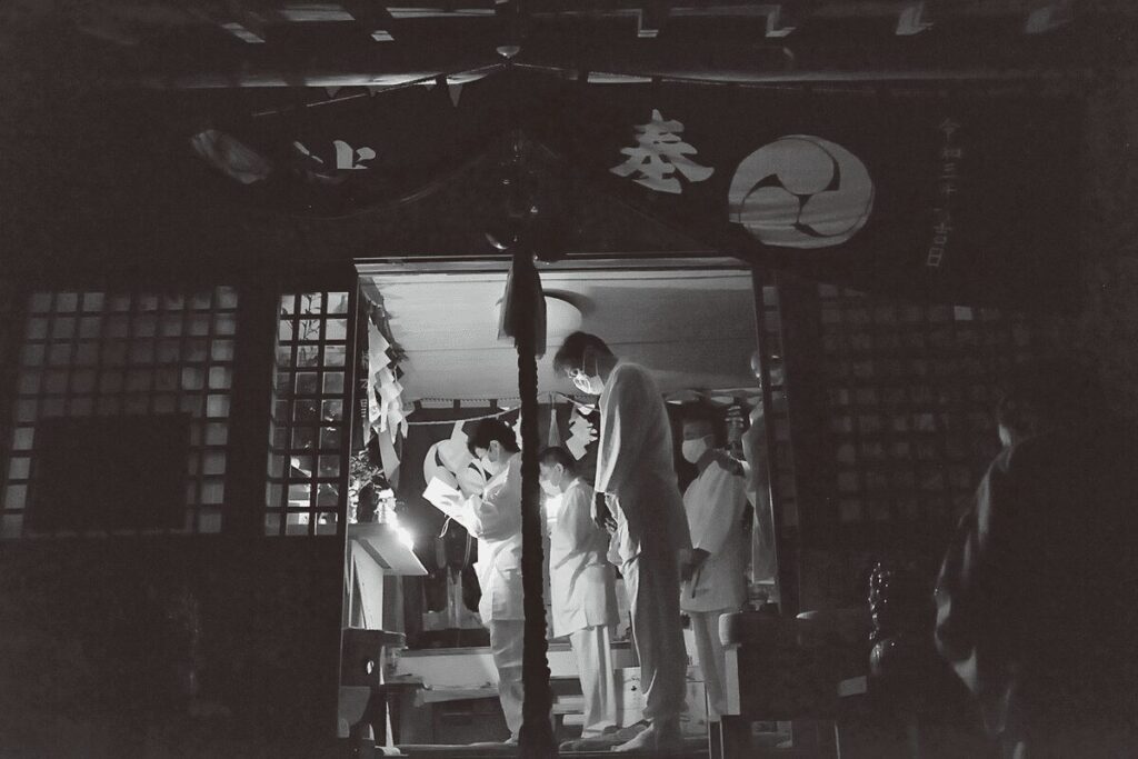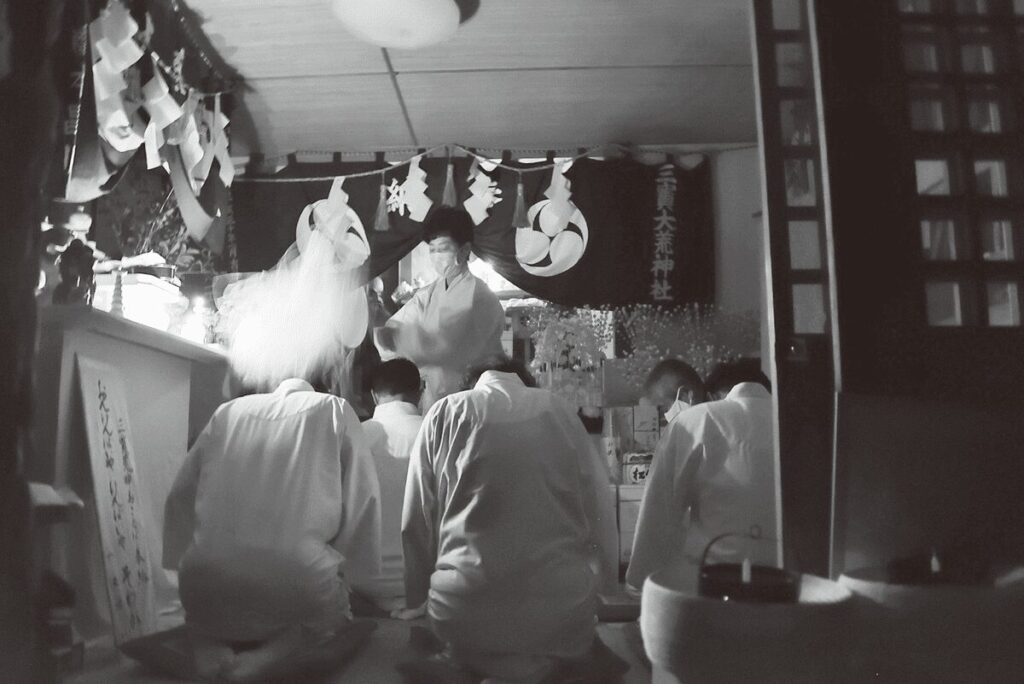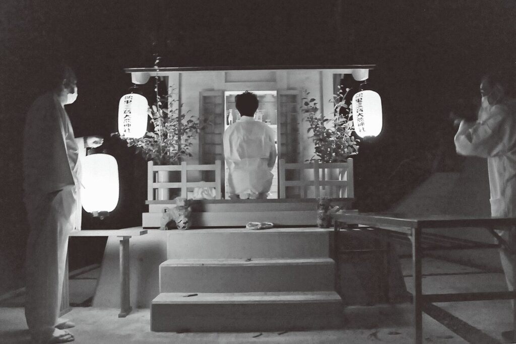 代表を勤める梨岡京美斎主の先導のもと、拝殿・社務所などすべての照明が消され、ロウソクの焔だけが揺らめく仄暗い拝殿で、幣と燧石による潔斎、神拝、祝詞奏状が行われ、晒を巻いて光を遮断した天照大神・素戔嗚大神・三宝大荒神・天鈿女命・猿田彦命のご神体、ご神体を奉安する三宮、種々の神宝などが、新築された奥宮につつがなく奉遷された。